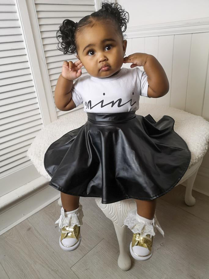 This set comes with a white t-shirt that says "Mini Boss" and a faux leather skirt. You will absolutely adore it!